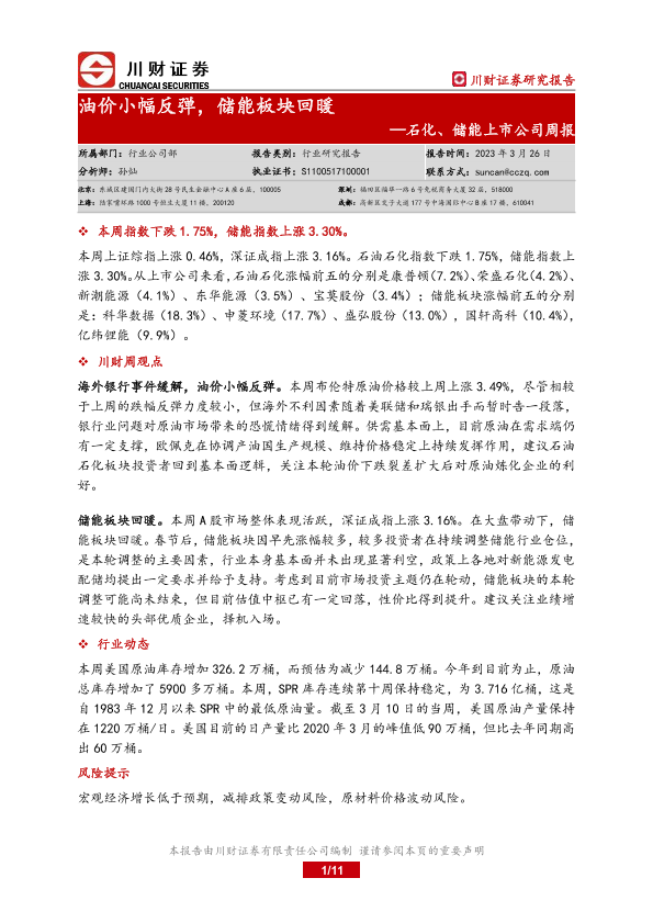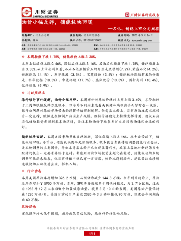【川财证券】【20230326】石化、储能上市公司周报:油价小幅反弹,储能板块回暖-11页