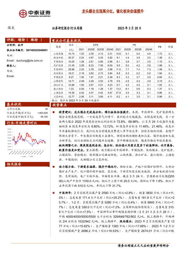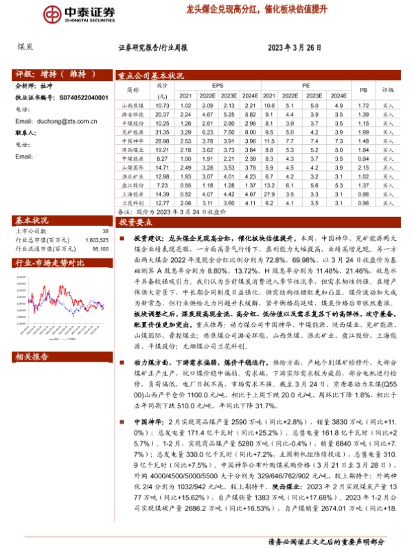【中泰证券】【20230326】中泰证券-煤炭行业周报:龙头煤企兑现高分红,催化板块估值提升-27页