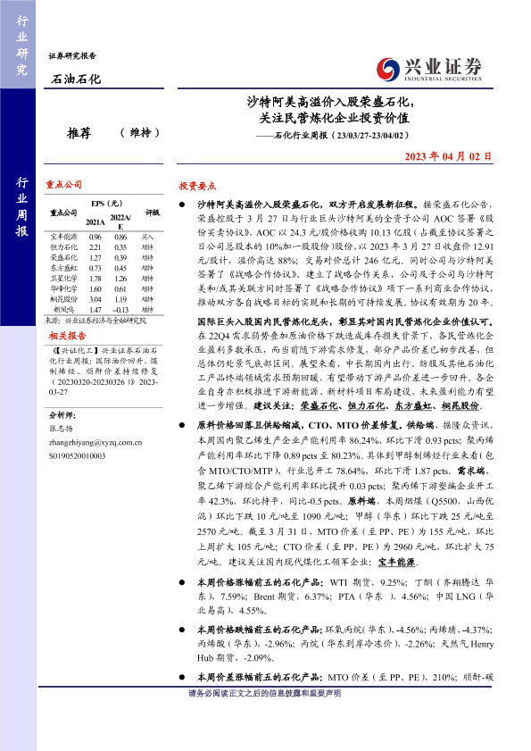 【兴业证券】【20230402】沙特阿美高溢价入股荣盛石化,关注民营炼化企业投资价值——石化行业周报(23/03/27-23/04/02)-17页