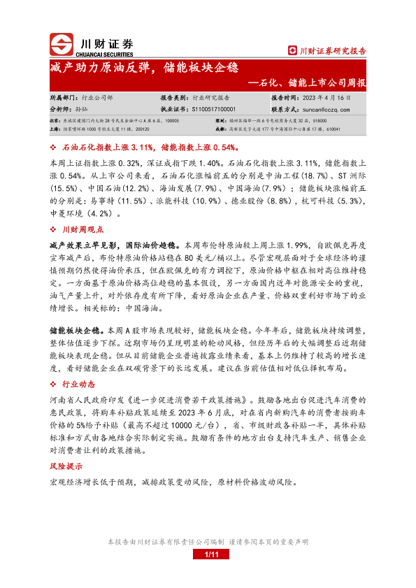 【川财证券】【20230416】20230416-川财证券-石化、储能上市公司周报:减产助力原油反弹,储能板块企稳-11页