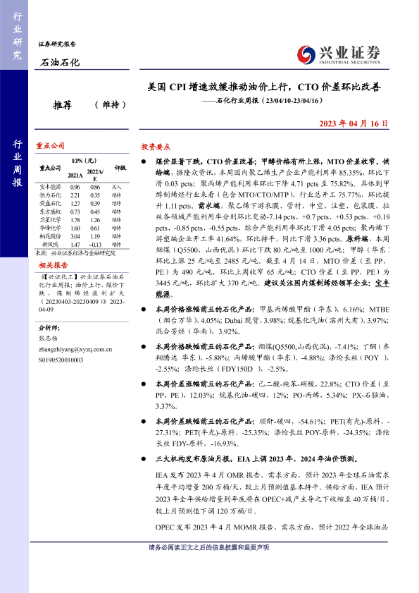 【兴业证券】【20230416】美国CPI增速放缓推动油价上行,CTO价差环比改善-17页