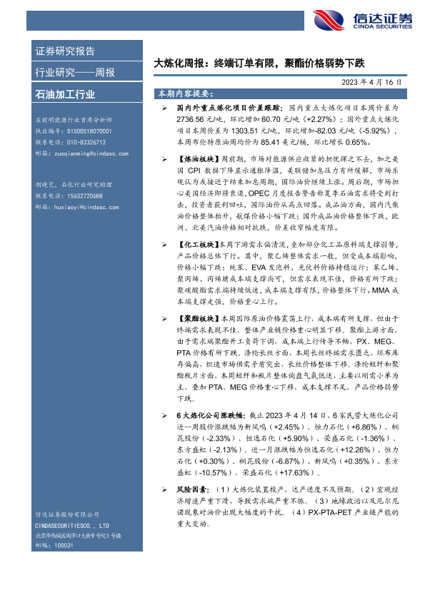 【信达证券】【20230416】大炼化周报:终端订单有限,聚酯价格弱势下跌-20页