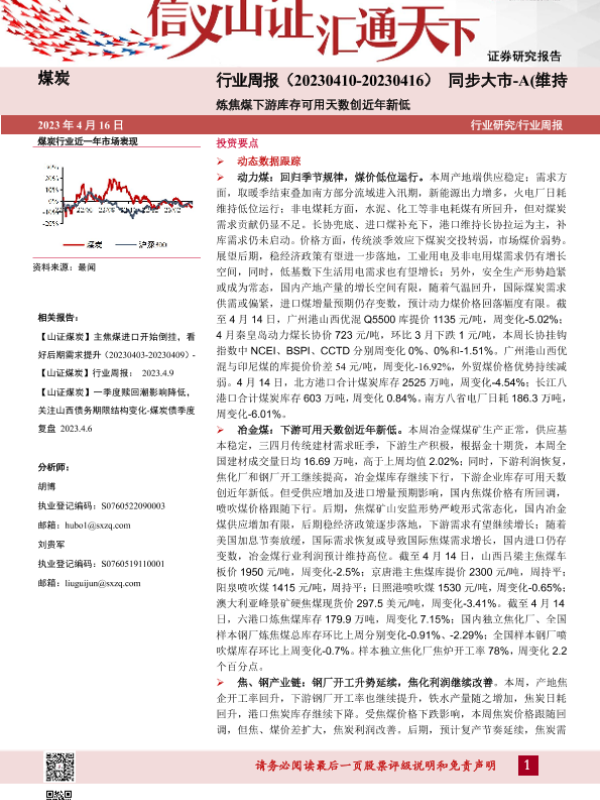 【山西证券】【20230416】20230416-山西证券-煤炭行业周报:炼焦煤下游库存可用天数创近年新低-19页