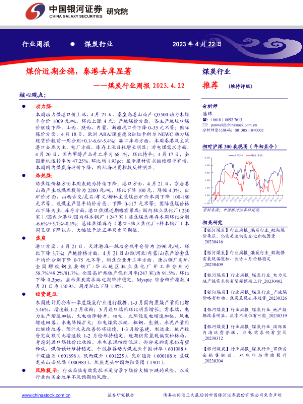 【银河证券】【20230422】20230422-中国银河-煤炭行业周报:煤价近期企稳,秦港去库显著-21页