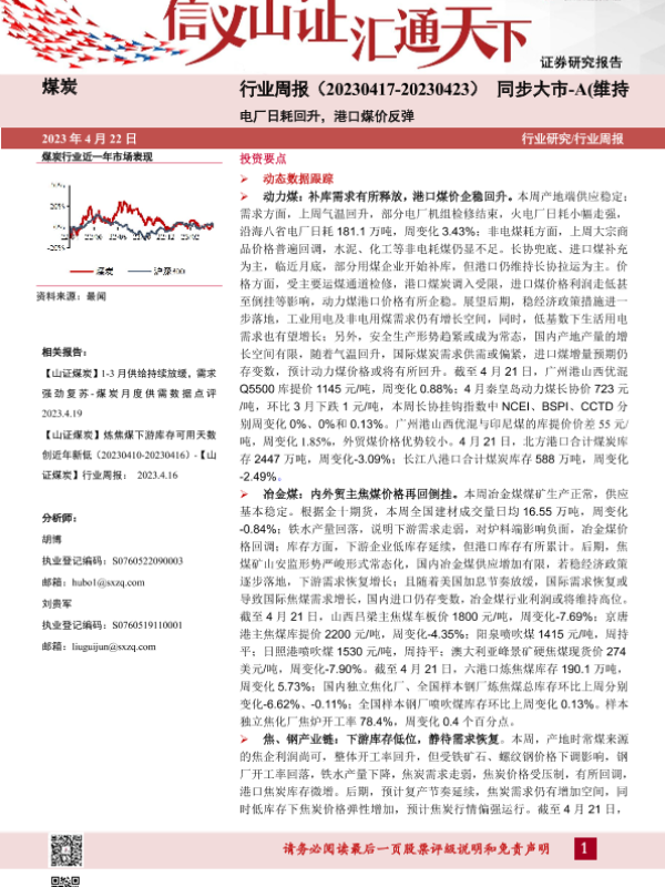 【山西证券】【20230422】煤炭行业周报:电厂日耗回升,港口煤价反弹-19页