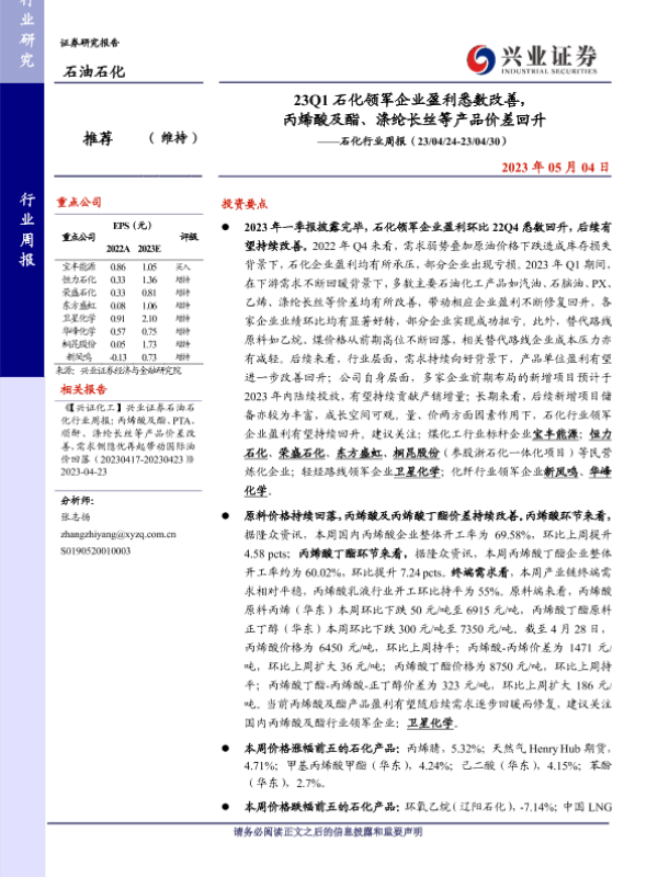 【兴业证券】【20230504】23Q1石化领军企业盈利悉数改善,丙烯酸及酯、涤纶长丝等产品价差回升——石化行业周报(23/04/24-23/04/30)-16页
