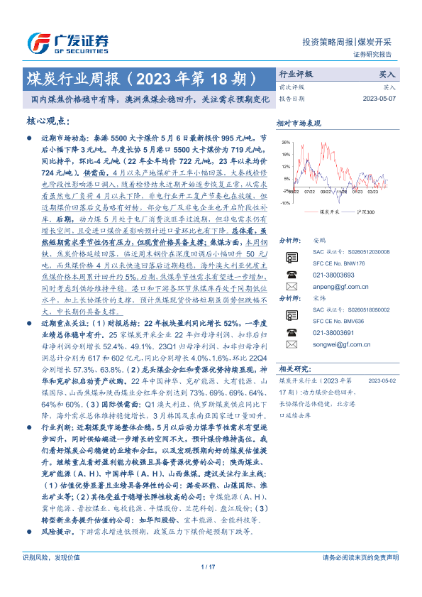 【广发证券】【20230507】20230507-广发证券-煤炭行业周报(2023年第18期):国内煤焦价格稳中有降,澳洲焦煤企稳回升,关注需求预期变化-17页