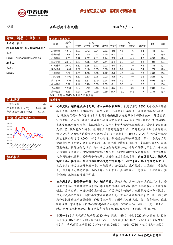 【中泰证券】【20230506】中泰证券-煤炭行业周报:煤价探底接近尾声,需求向好积极酝酿-27页