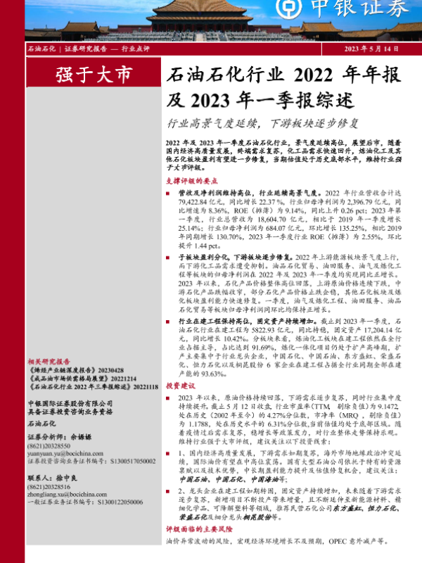 【中银证券】【20230514】石油石化行业2022年年报及2023年一季报综述:行业高景气度延续,下游板块逐步修复-17页
