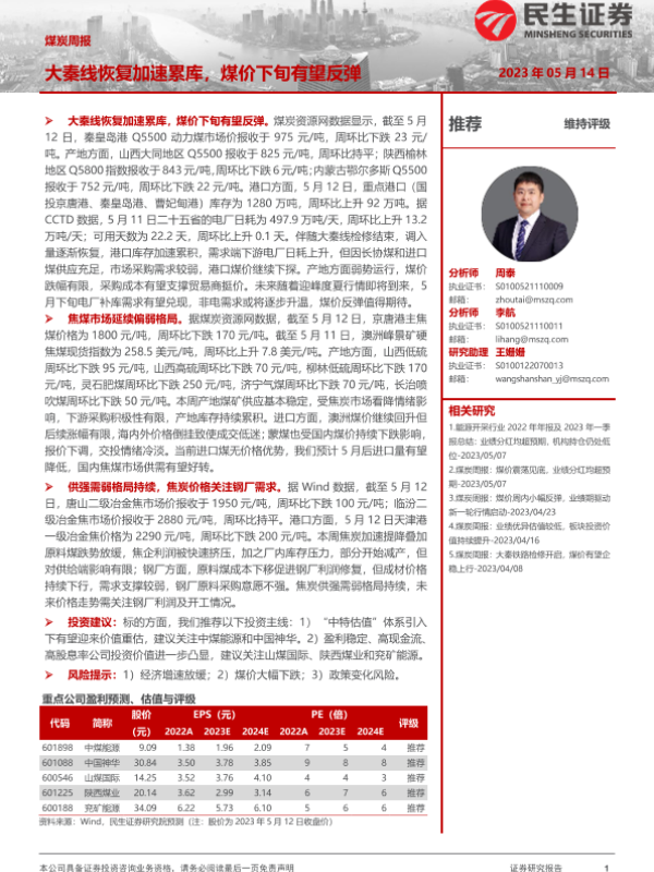 【民生证券】【20230514】20230514-民生证券-煤炭周报:大秦线恢复加速累库,煤价下旬有望反弹-20页