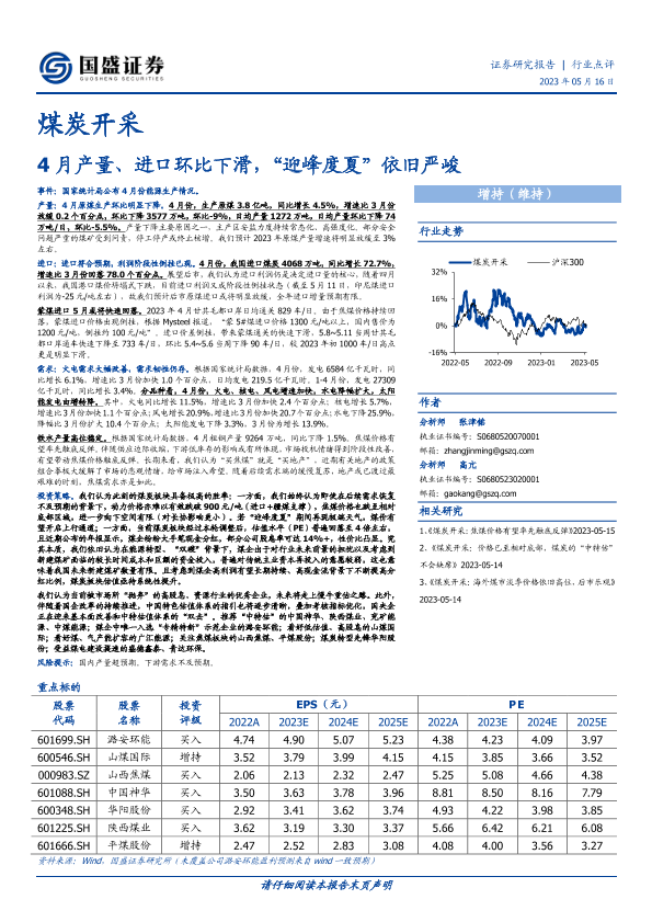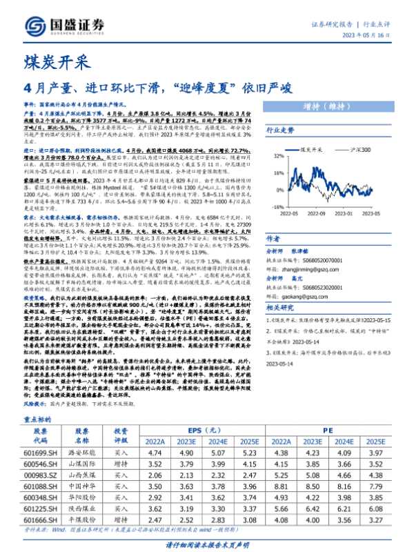 【国盛证券】【20230516】20230516-国盛证券-煤炭开采:4月产量、进口环比下滑,“迎峰度夏”依旧严峻-10页