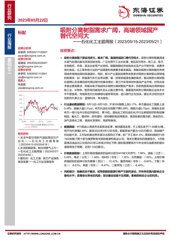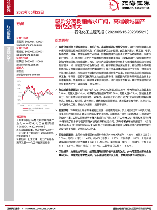 【东海证券】【20230522】20230521-东海证券-石化化工主题周报:吸附分离树脂需求广阔,高端领域国产替代空间大-29页