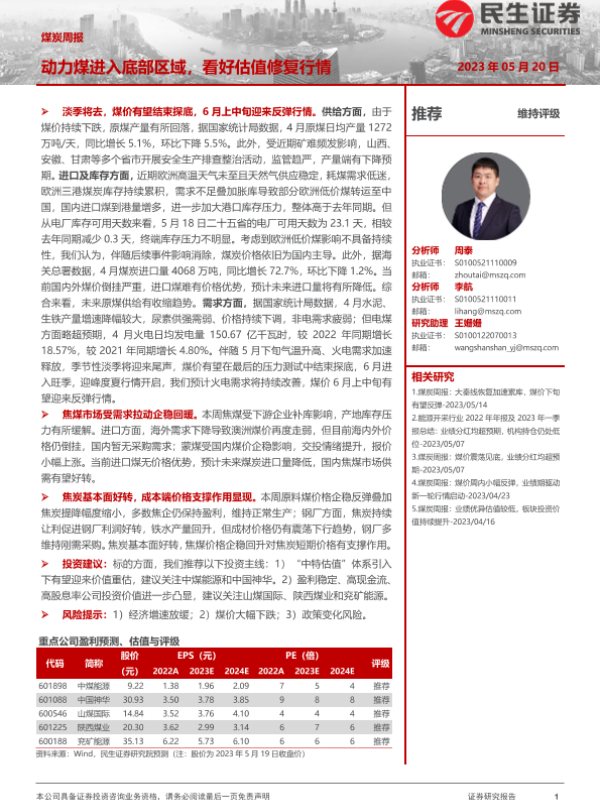【民生证券】【20230520】20230520-民生证券-煤炭周报:动力煤进入底部区域,看好估值修复行情-22页