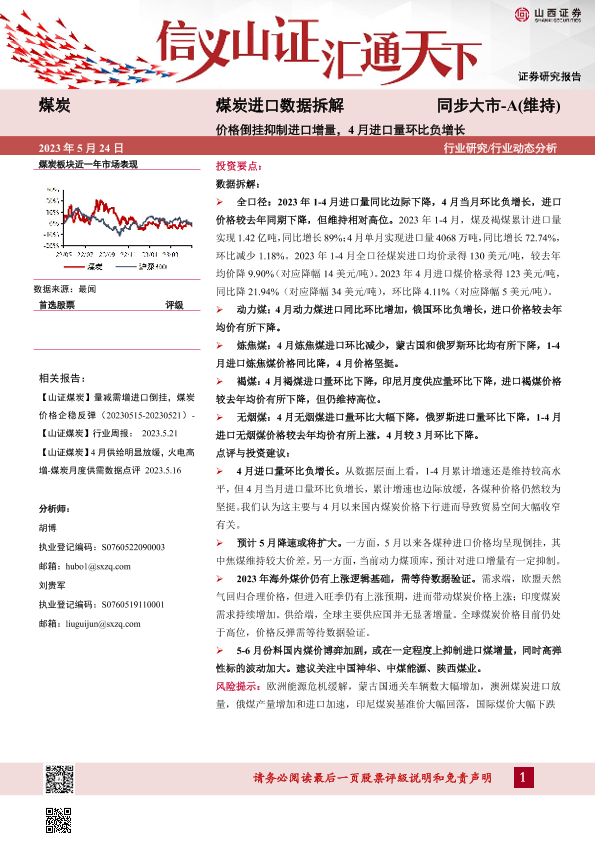 【山西证券】【20230524】煤炭进口数据拆解:价格倒挂抑制进口增量,4月进口量环比负增长-11页