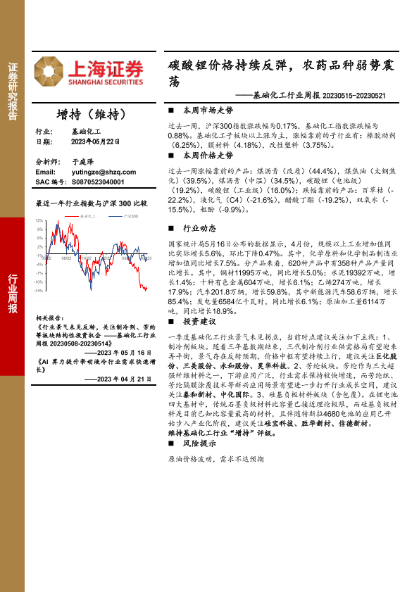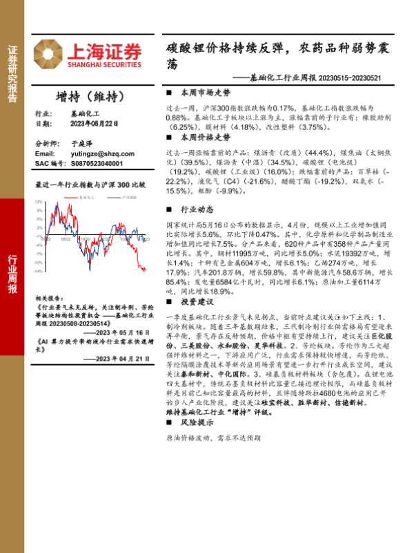 【上海证券】【20230522】基础化工行业周报:碳酸锂价格持续反弹,农药品种弱势震荡-12页
