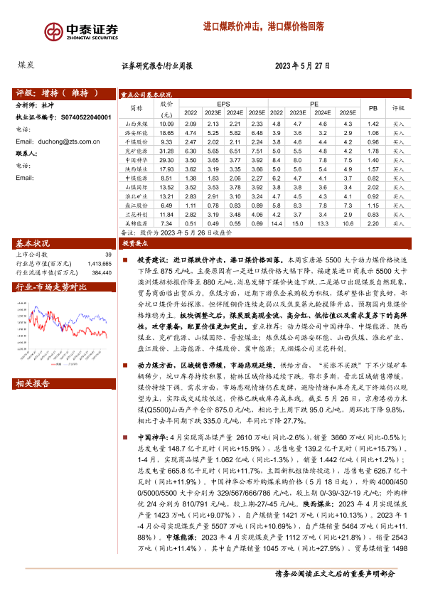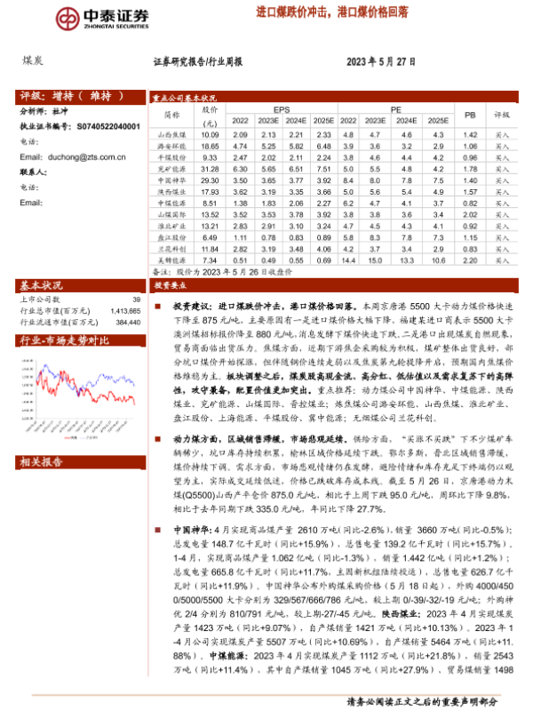 【中泰证券】【20230527】中泰证券-煤炭行业周报:进口煤跌价冲击,港口煤价格回落-27页