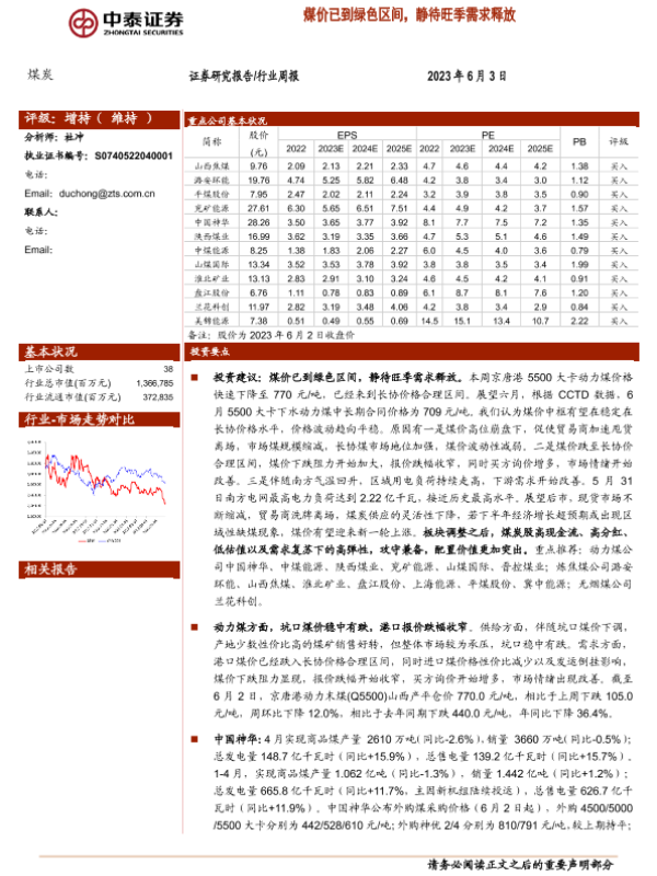 【中泰证券】【20230603】中泰证券-煤炭行业周报:煤价已到绿色区间,静待旺季需求释放-27页