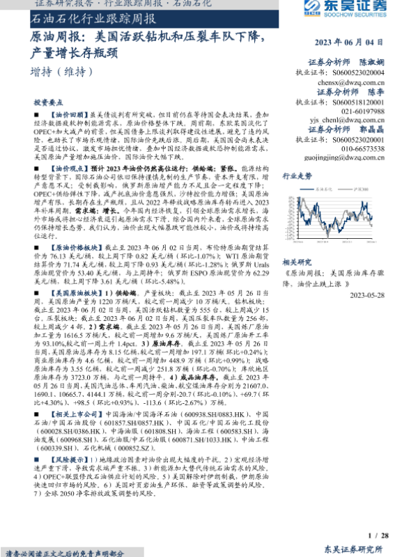 【东吴证券】【20230604】20230604-东吴证券-原油周报:美国活跃钻机和压裂车队下降,产量增长存瓶颈-28页