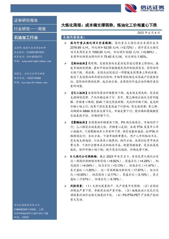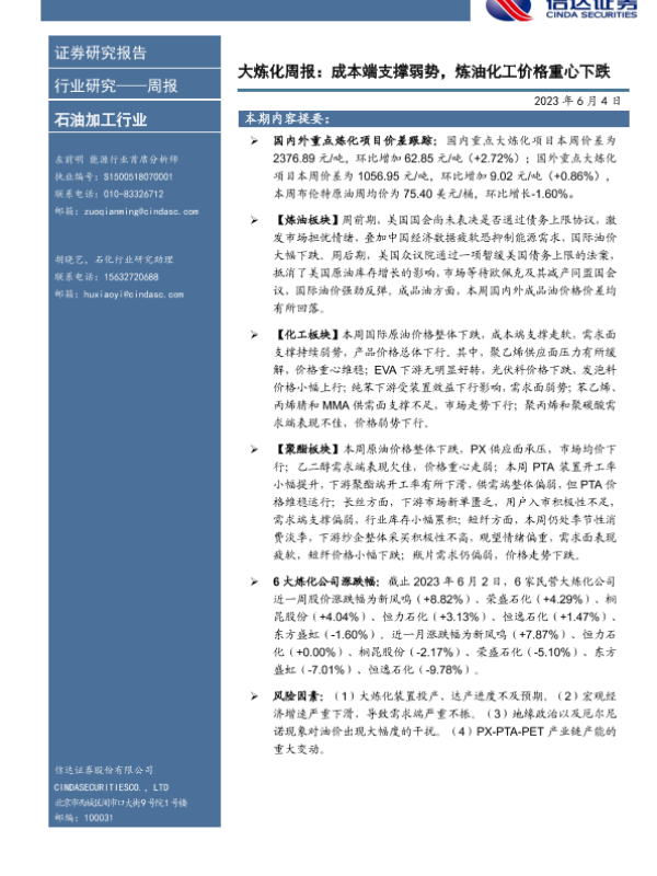 【信达证券】【20230604】大炼化周报:成本端支撑弱势,炼油化工价格重心下跌-20页