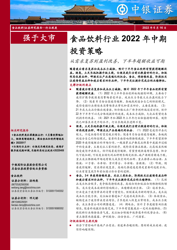 【中银证券】【20220616】食品饮料行业2022年中期投资策略:从需求复苏到盈利改善,下半年超额收益可期-27页