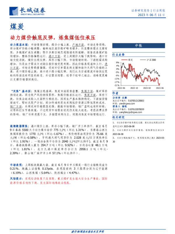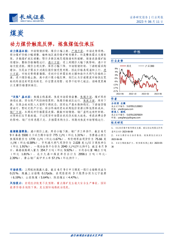 【长城证券】【20230611】20230611-长城证券-煤炭行业周报:动力煤价触底反弹,炼焦煤低位承压-18页