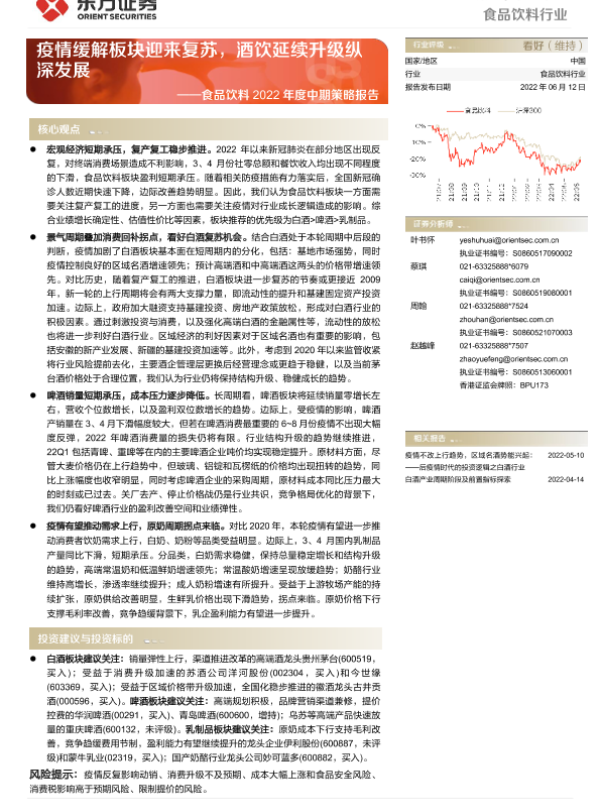 【东方证券】【20220612】食品饮料行业2022年度中期策略报告:疫情缓解板块迎来复苏,酒饮延续升级纵深发展-37页