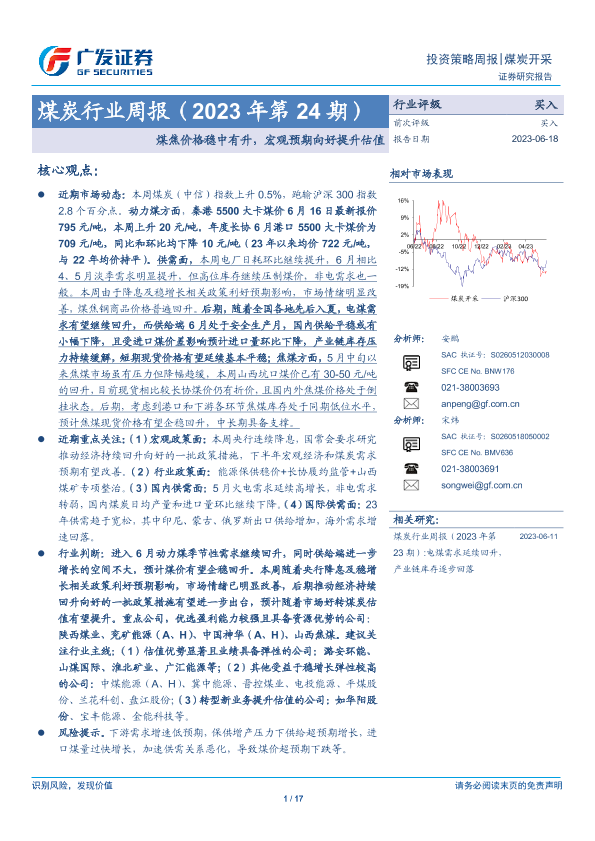 【广发证券】【20230618】20230618-广发证券-煤炭行业周报(2023年第24期):煤焦价格稳中有升,宏观预期向好提升估值-17页