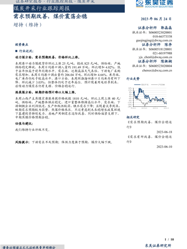 【东吴证券】【20230624】20230624-东吴证券-煤炭开采行业跟踪周报:需求预期改善,煤价震荡企稳-10页