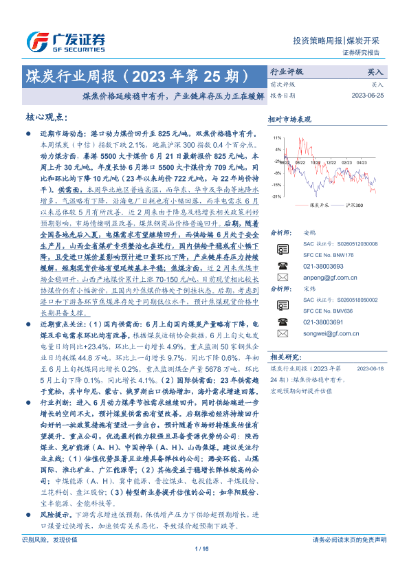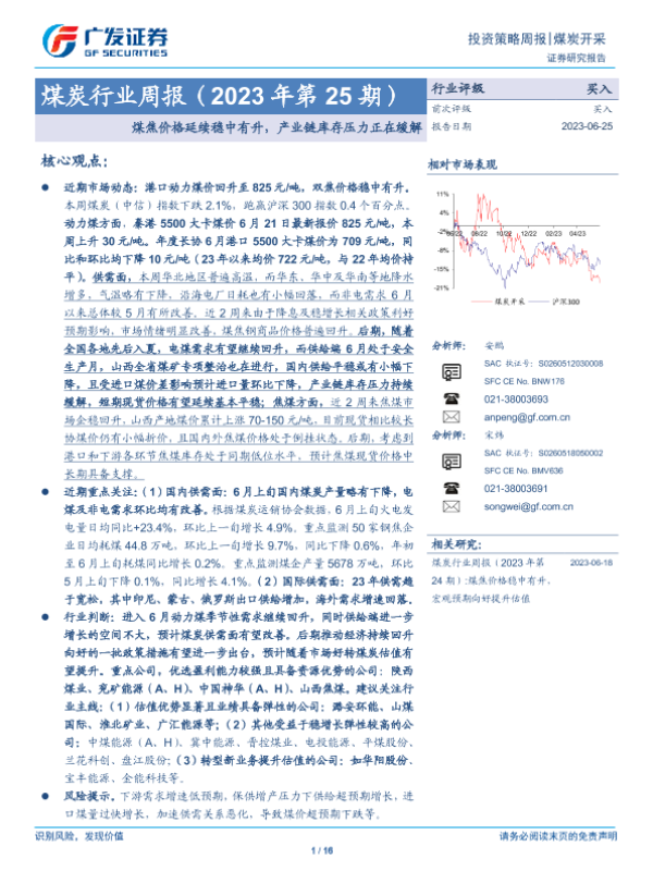 【广发证券】【20230625】20230625-广发证券-煤炭行业周报(2023年第25期):煤焦价格延续稳中有升,产业链库存压力正在缓解-16页