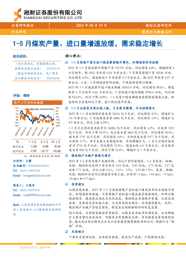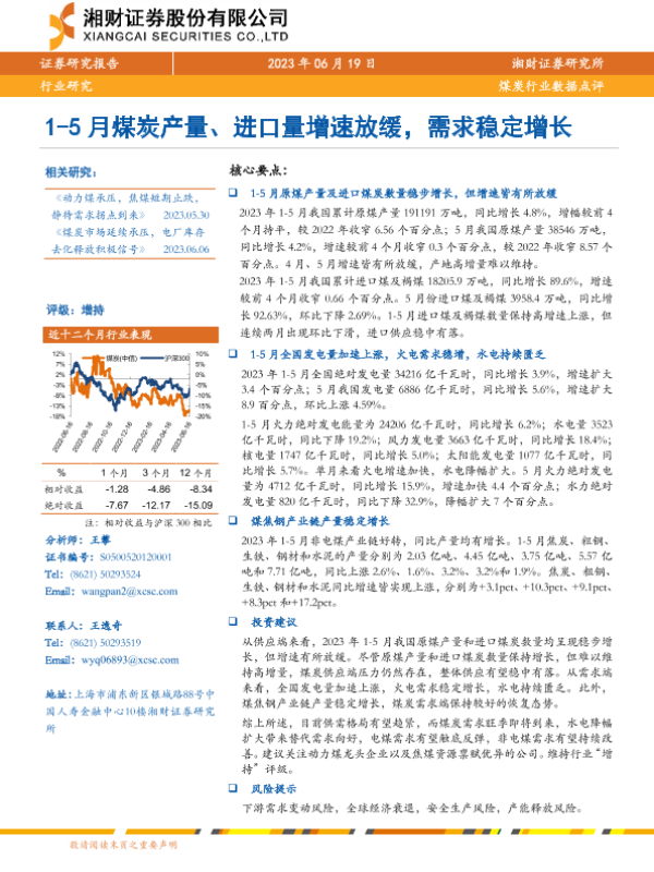 【湘财证券】【20230619】20230619-湘财证券-煤炭行业数据点评:1-5月煤炭产量、进口量增速放缓,需求稳定增长-10页