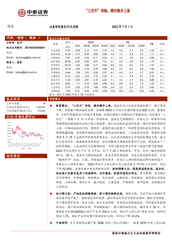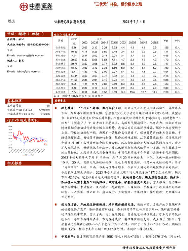 【中泰证券】【20230701】20230701-中泰证券-煤炭行业周报:“三伏天”将临,煤价稳步上涨-27页
