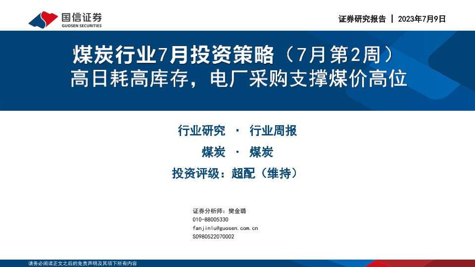 【国信证券】【20230709】20230709-国信证券-煤炭行业7月投资策略(7月第2周):高日耗高库存,电厂采购支撑煤价高位-31页
