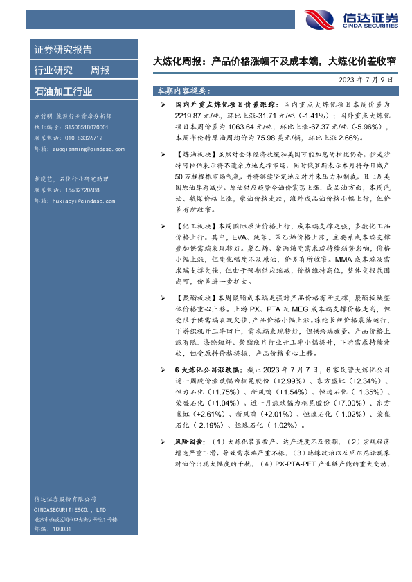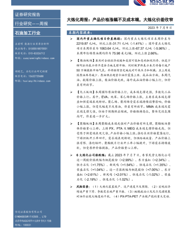 【信达证券】【20230709】20230709-信达证券-大炼化周报:产品价格涨幅不及成本端,大炼化价差收窄-19页