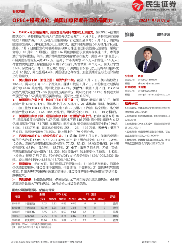 【民生证券】【20230709】20230709-民生证券-石化周报:OPEC+提振油价,美国加息预期升温仍是阻力-32页