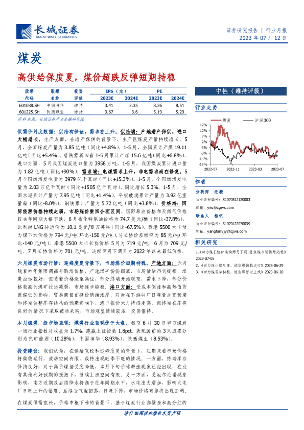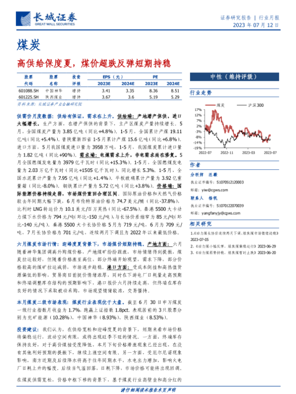 【长城证券】【20230712】20230712-长城证券-煤炭行业月报:高供给保度夏,煤价超跌反弹短期持稳-21页