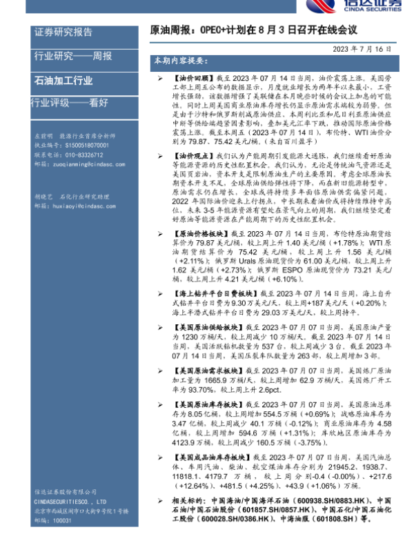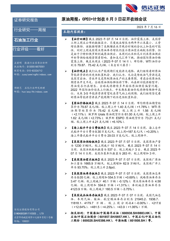 【信达证券】【20230716】原油周报:OPEC+计划在8月3日召开在线会议-26页