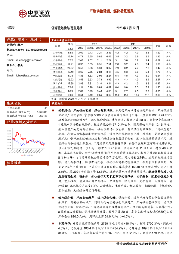 【中泰证券】【20230722】中泰证券-煤炭行业周报:产地供给紧缩,煤价易涨难跌-25页