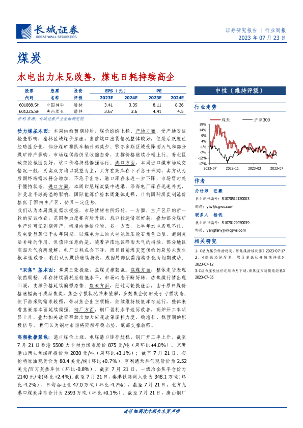 【长城证券】【20230723】20230723-长城证券-煤炭行业周报:水电出力未见改善,煤电日耗持续高企-19页