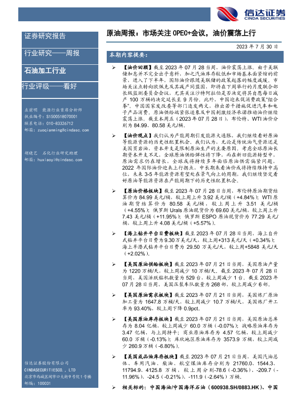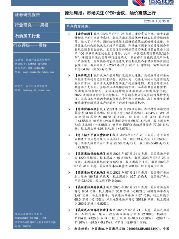 【信达证券】【20230730】原油周报:市场关注OPEC+会议,油价震荡上行-25页