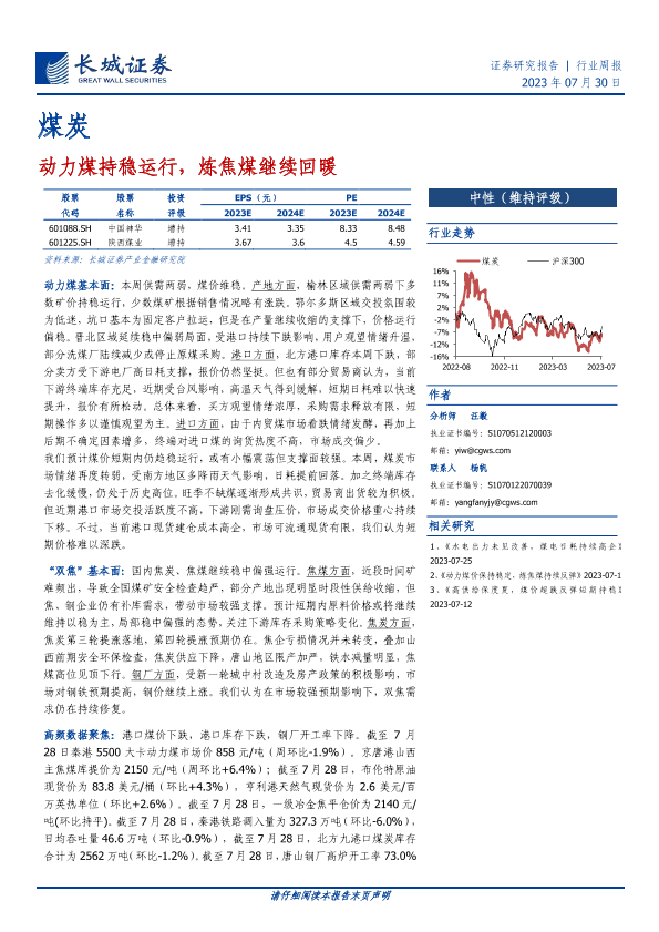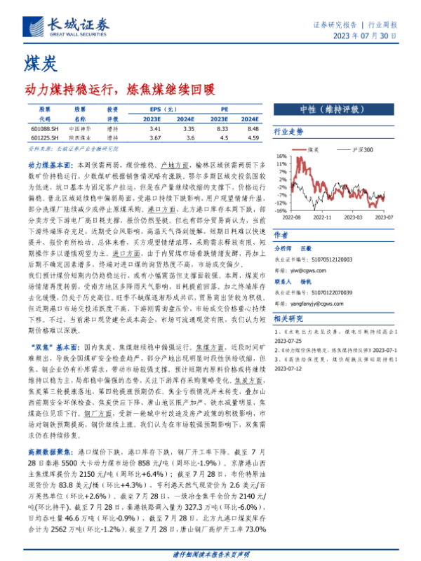 【长城证券】【20230730】20230730-长城证券-煤炭行业周报:动力煤持稳运行,炼焦煤继续回暖-19页