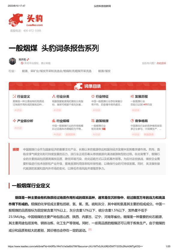 【头豹研究院】【20230810】一般烟煤 头豹词条报告系列-20页