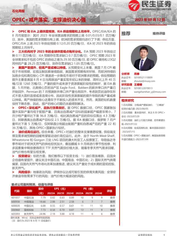 【民生证券】【20230812】20230812-民生证券-石化周报:OPEC+减产落实,支撑油价决心强-32页