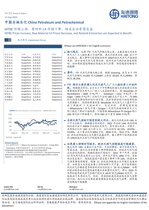 【海通国际】【20230814】中国石油石化:MTBE价格上涨,原材料C4价格下降,相关企业有望受益-14页