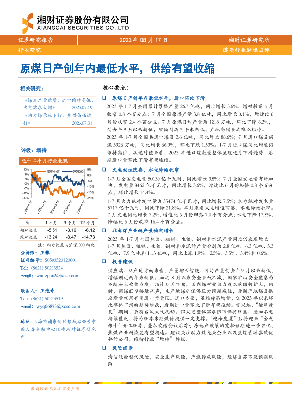 【湘财证券】【20230817】20230817-湘财证券-煤炭行业数据点评:原煤日产创年内最低水平,供给有望收缩-10页
