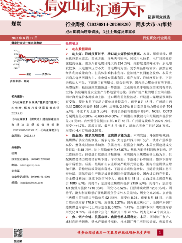 【山西证券】【20230819】煤炭行业周报:成材即将向旺季切换,关注主焦煤补库需求-19页