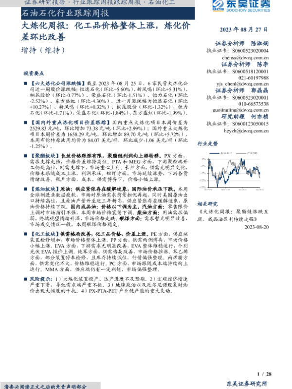 【东吴证券】【20230827】20230827-东吴证券-大炼化周报:化工品价格整体上涨,炼化价差环比改善-28页