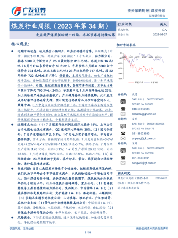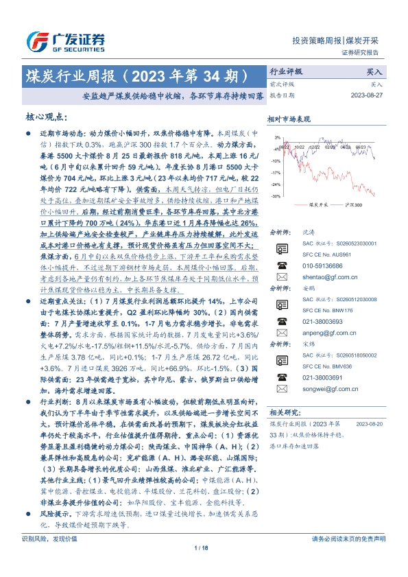【广发证券】【20230827】20230827-广发证券-煤炭行业周报(2023年第34期):安监趋严煤炭供给稳中收缩,各环节库存持续回落-18页