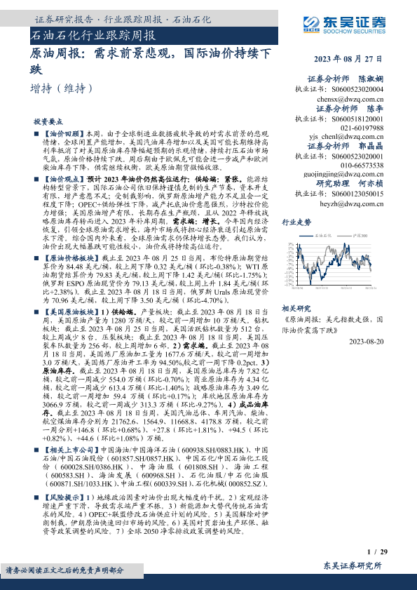 【东吴证券】【20230827】20230827-东吴证券-石油石化行业跟踪周报:原油周报,需求前景悲观,国际油价持续下跌-29页