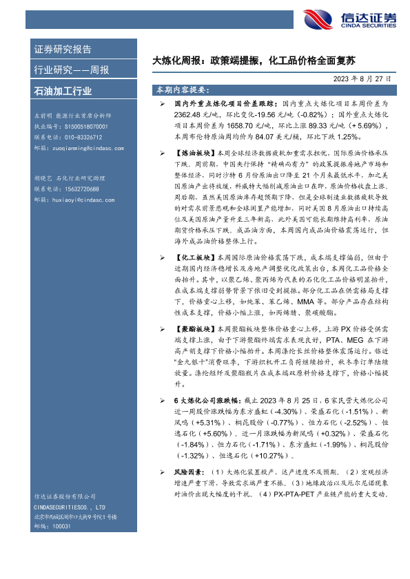 【信达证券】【20230827】大炼化周报:政策端提振,化工品价格全面复苏-18页