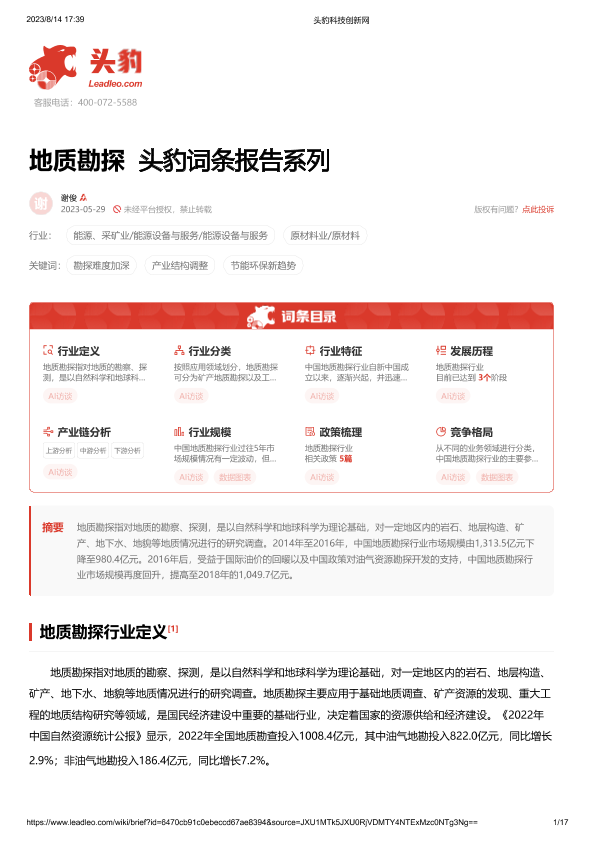 【头豹研究院】【20230828】地质勘探 头豹词条报告系列-17页